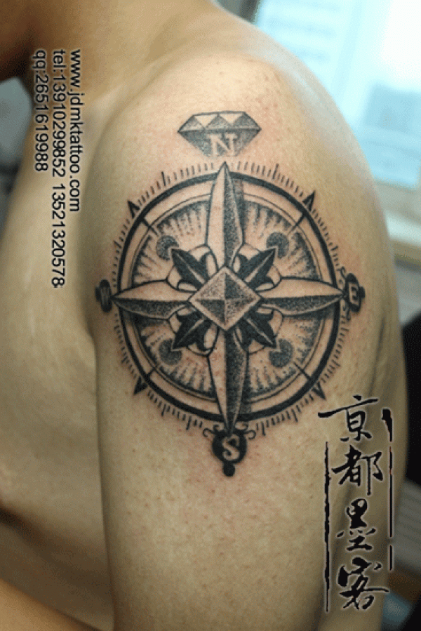 京都墨客纹身作品 男士大臂指南针黑白纹身