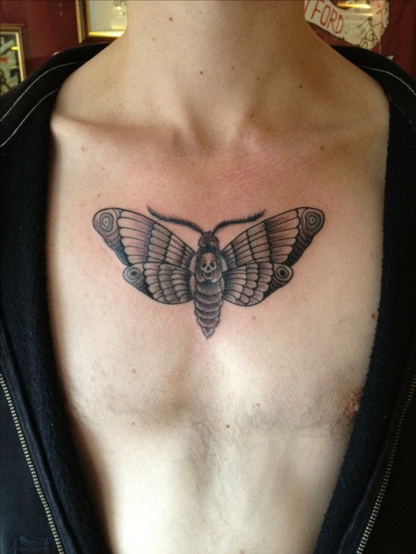 胸部卡通风格骷髅小蝴蝶纹身图案