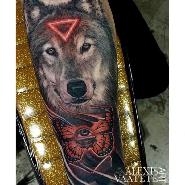小臂彩色神秘狼与红三角和蝴蝶眼睛纹身图案