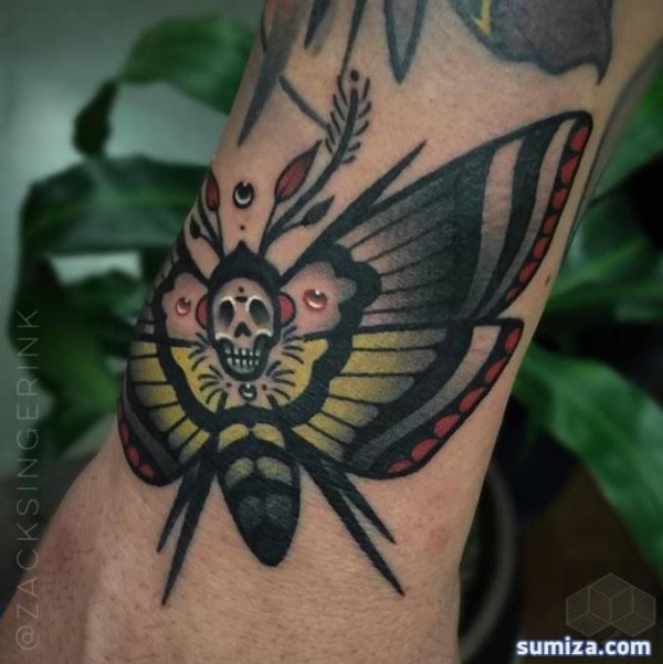 手腕old school彩色蝴蝶与骷髅纹身图案