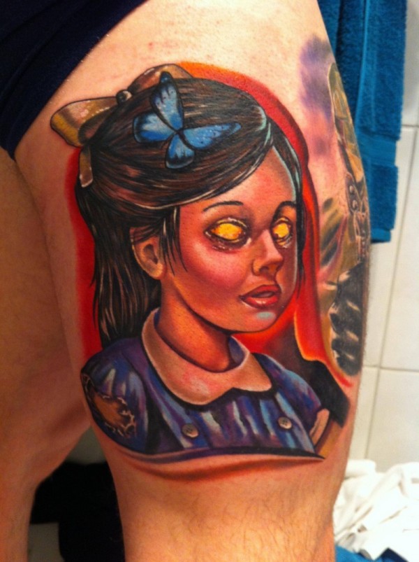 大腿恐怖风格邪恶怪物女孩与蝴蝶纹身图案