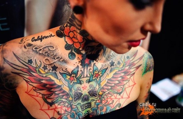 胸部墨西哥传统彩色骷髅翅膀与蝴蝶字母纹身图案