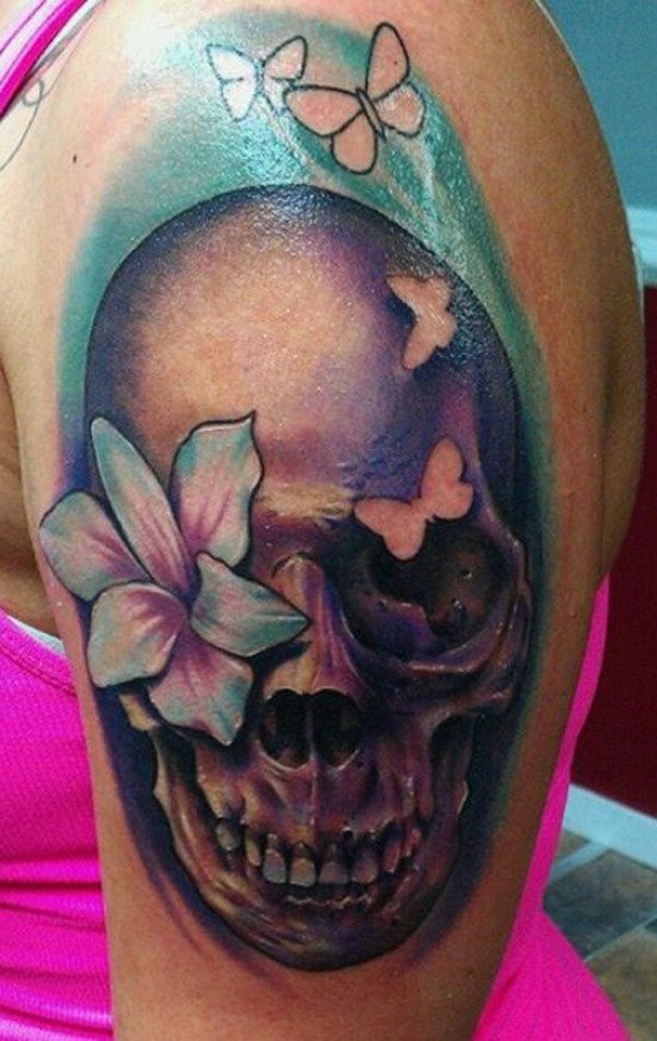 大臂彩色骷髅花朵和蝴蝶纹身图案