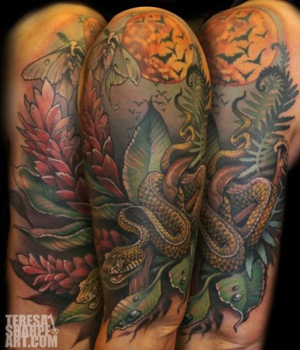 大臂植物蟒蛇与蝙蝠和蝴蝶纹身图案