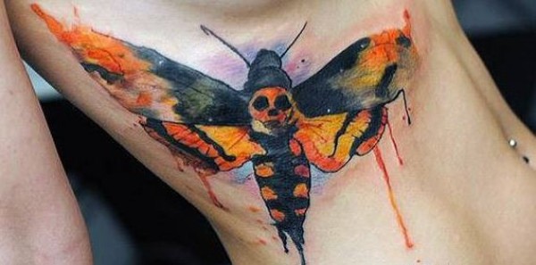侧肋水彩画风格蝴蝶骷髅纹身图案