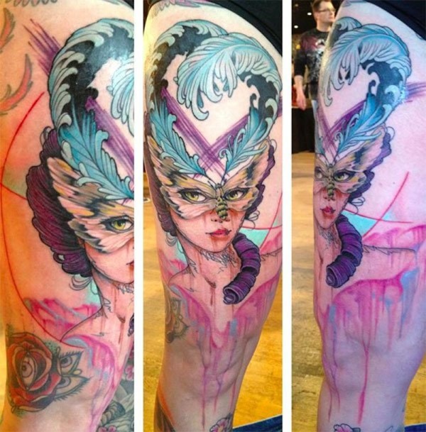 大腿old school女郎和蝴蝶面具水墨纹身图案
