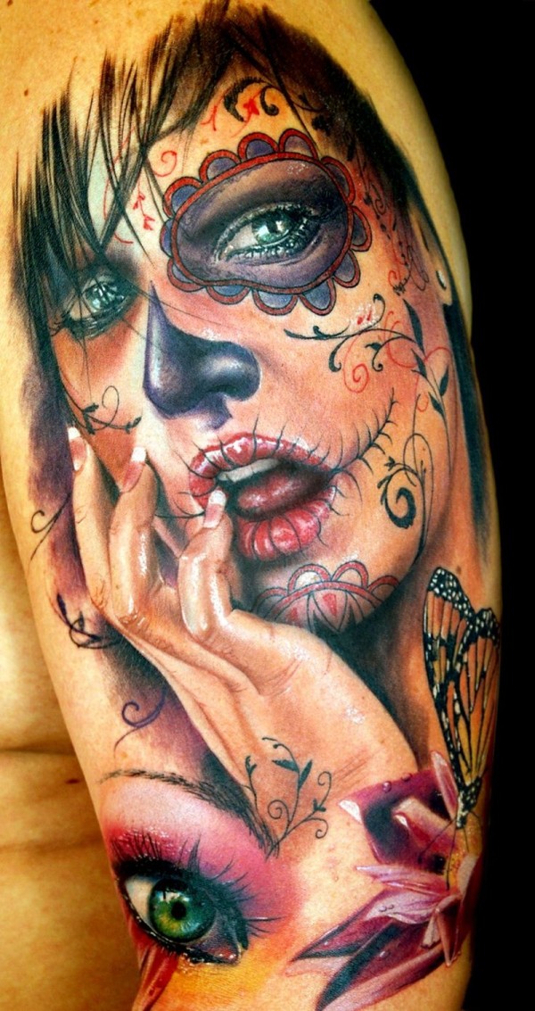 彩色死圣女孩肖像与花朵蝴蝶纹身图案