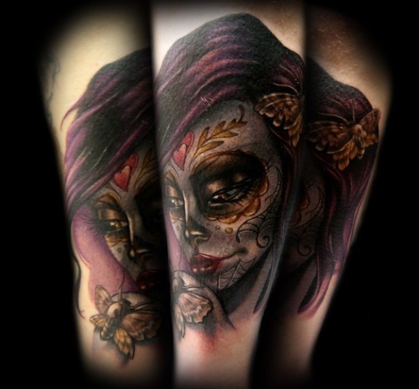 墨西哥传统彩色女子肖像蝴蝶纹身图案