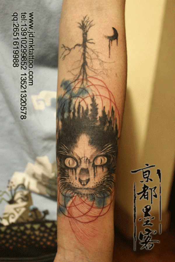 小臂生命树猫彩色纹身