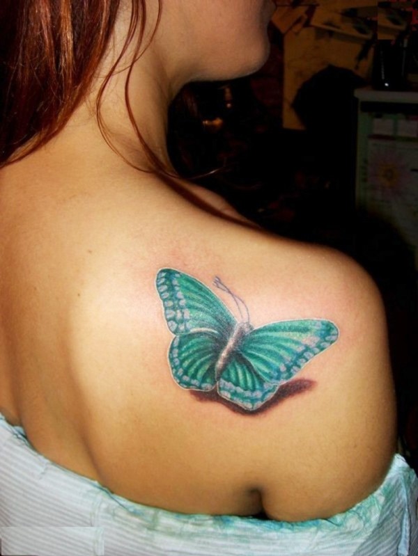 女性肩部写实逼真的可爱蝴蝶纹身图案