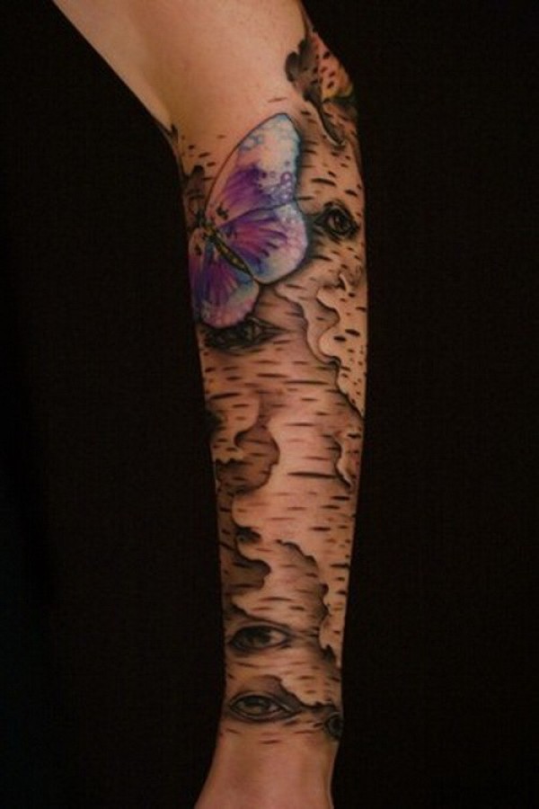 小臂灰色树皮眼睛和紫色蝴蝶纹身图案