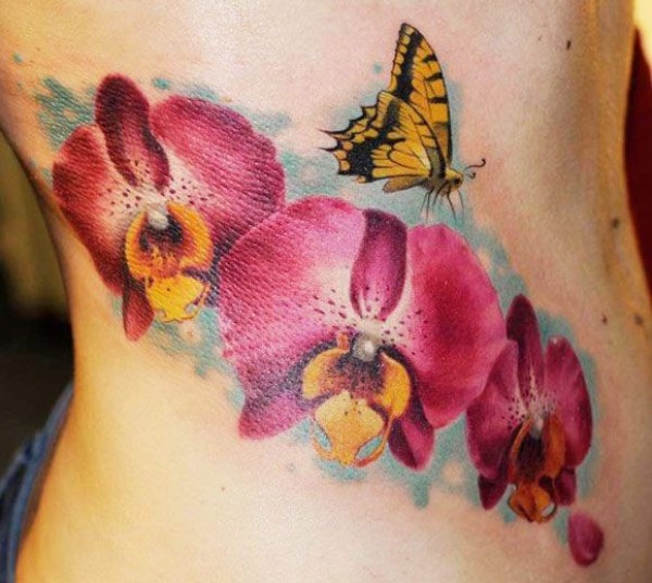 奇妙的蝴蝶兰花朵与黄蝴蝶纹身图案