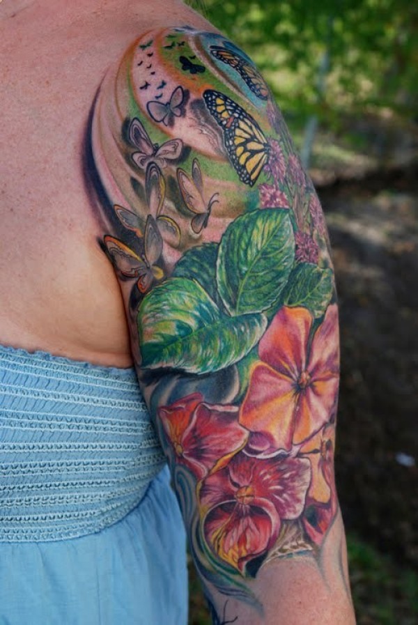 手臂写实的花朵与蝴蝶纹身图案