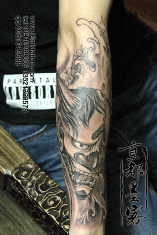 京都墨客纹身作品 包小臂般若黑白纹身