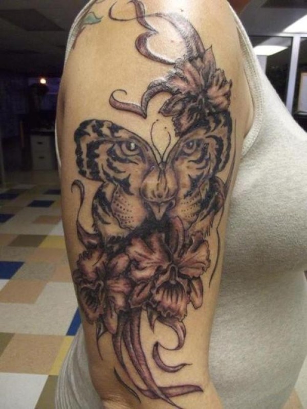 大臂花朵与老虎幻化的蝴蝶纹身图案