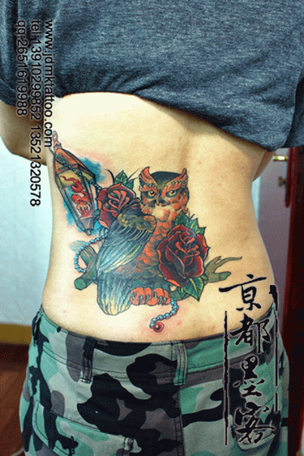 京都墨客纹身作品 后腰旧图遮盖猫头鹰彩色纹身