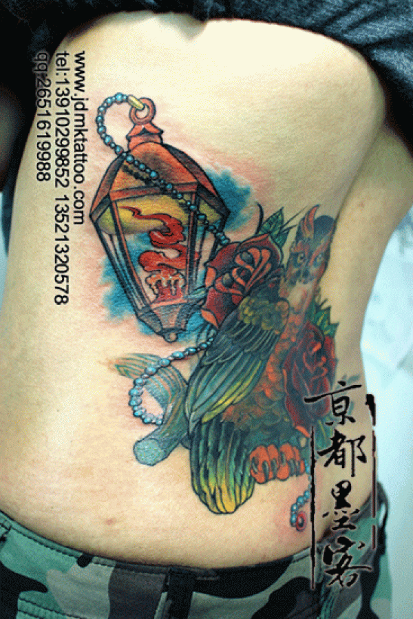 京都墨客纹身作品 后腰旧图遮盖猫头鹰彩色纹身