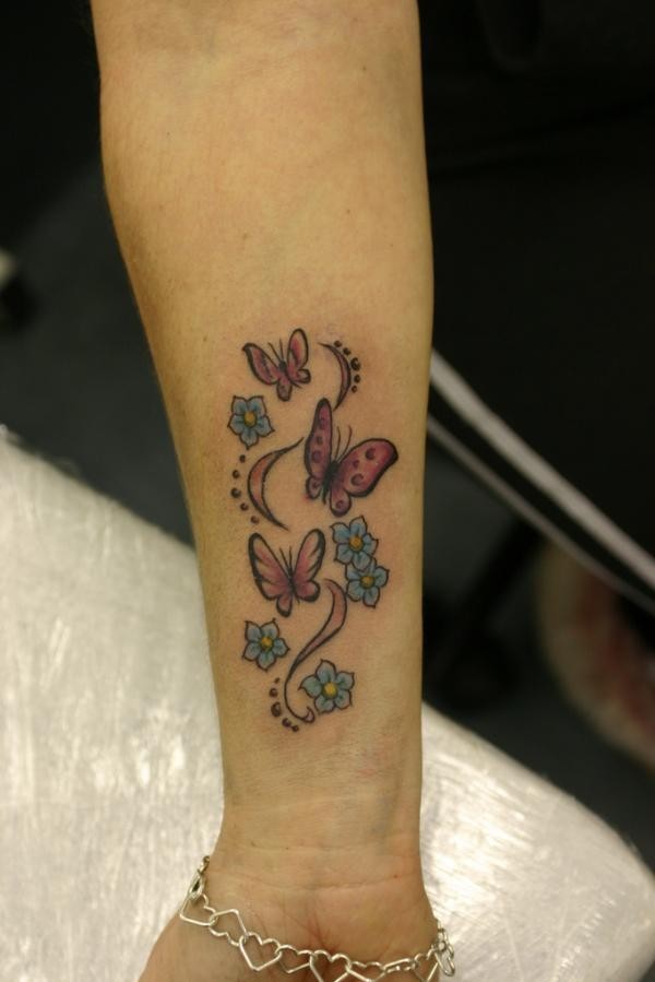 小臂粉红色蝴蝶和鲜花纹身图案