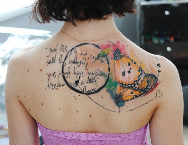 背部水彩画风格蝴蝶和英文字母纹身图案