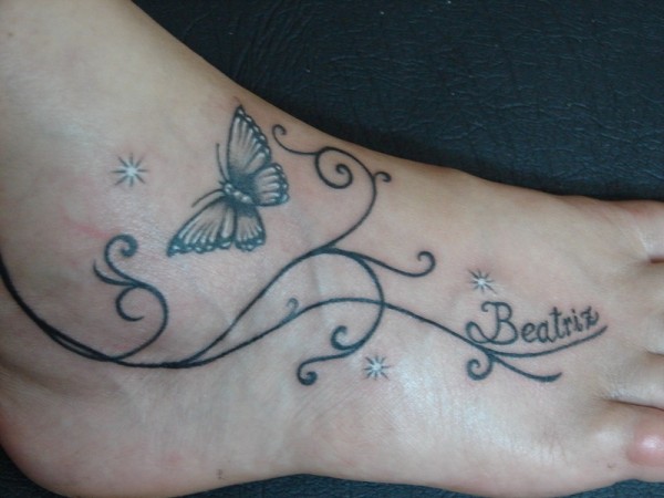 脚背蝴蝶藤蔓与字母纹身图案
