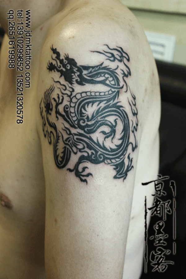 京都墨客纹身作品 大臂中国图腾龙黑白纹身