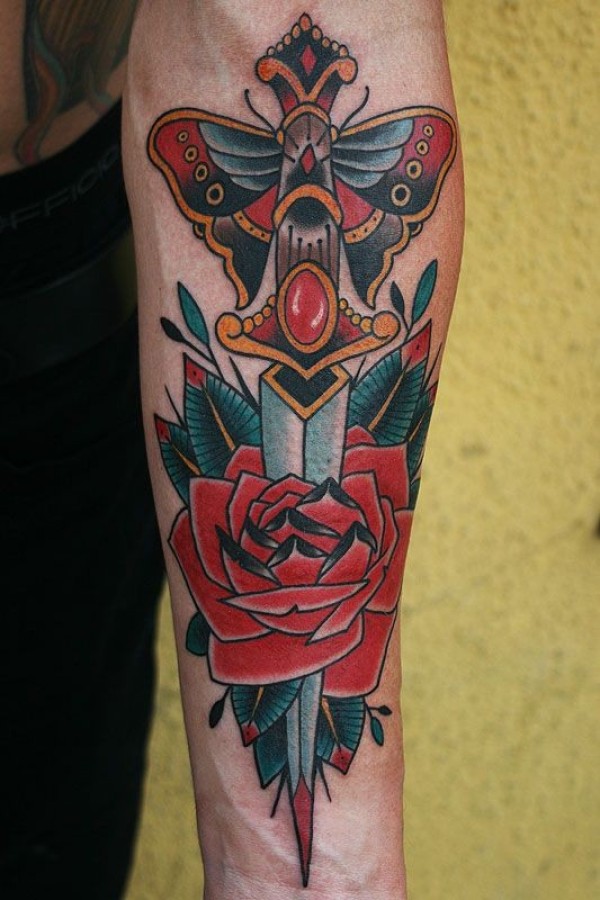 小臂old school红玫瑰与匕首蝴蝶翅膀纹身图案