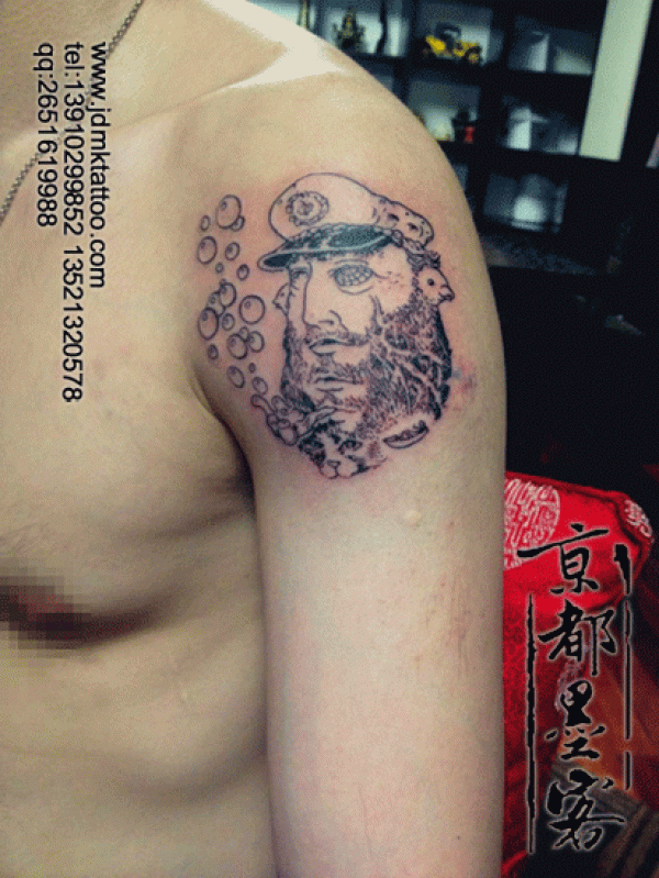 京都墨客纹身作品 胳膊老船长黑白纹身