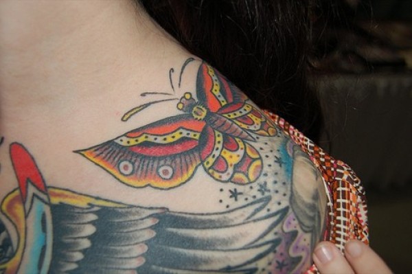 肩部五颜六色的蝴蝶纹身图案