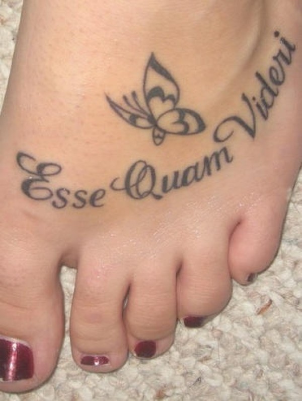脚背拉丁文字母和蝴蝶纹身图案