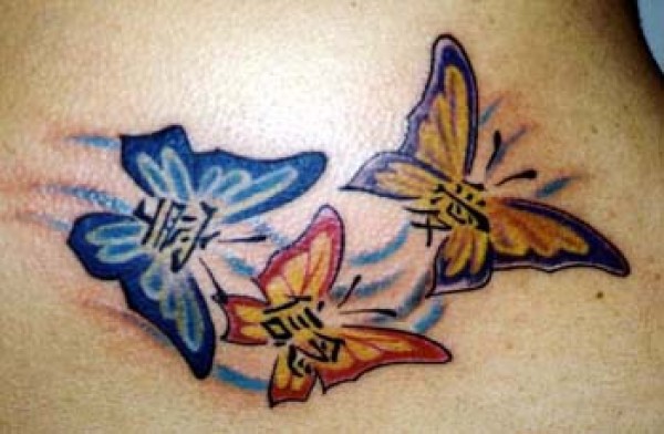 三只彩色蝴蝶和汉字纹身图案