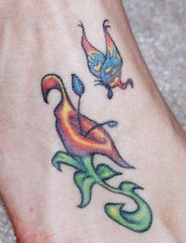 五颜六色的蝴蝶与花朵脚背纹身图案