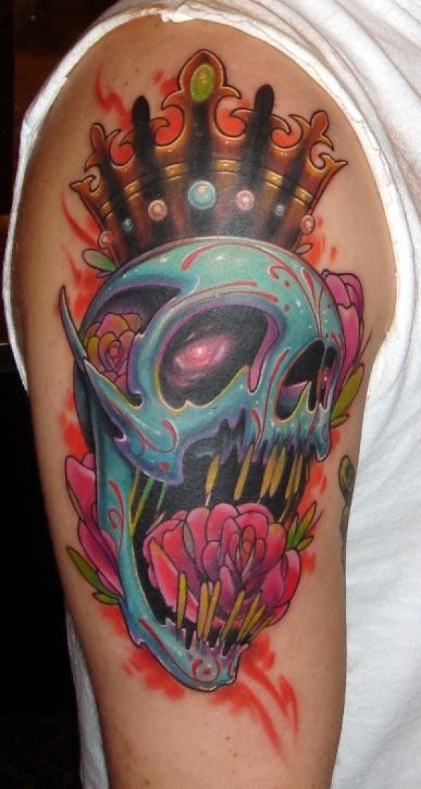 大臂彩色幻想骷髅与皇冠花朵纹身图案
