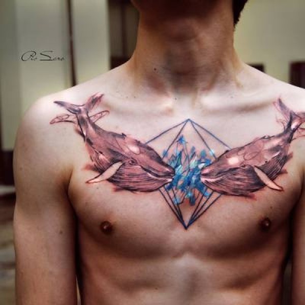 胸部卡通鲸鱼与大钻石彩色纹身图案