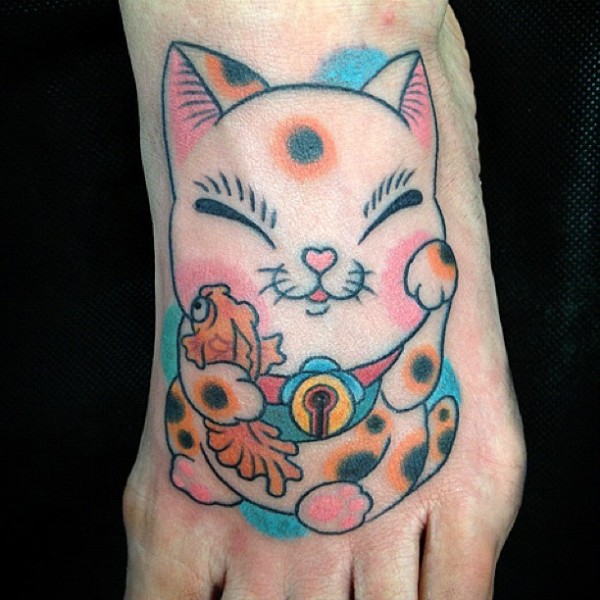 脚背好看的动漫微笑招财猫与鲤鱼纹身图案