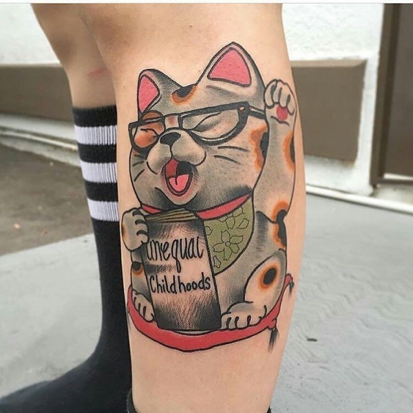 小腿可爱的卡通招财猫和眼镜纹身图案