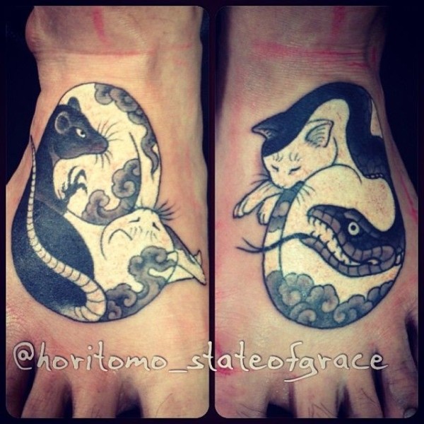 脚背简单的卡通猫和老鼠蛇纹身图案