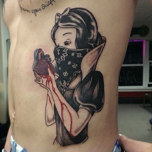 侧肋卡通白雪红烛与红色的心脏纹身图案
