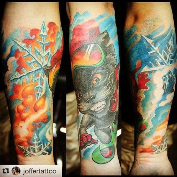 小臂彩色卡通滑雪眼镜猫和雪花纹身图案