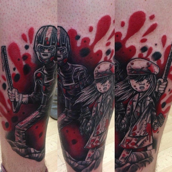 小腿彩色血腥的卡通女孩与男子面具纹身图案