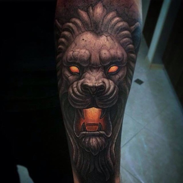 小臂彩色神秘石狮子雕像纹身图案