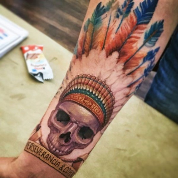 小臂彩色卡通古印度颅骨羽毛和字母纹身图案