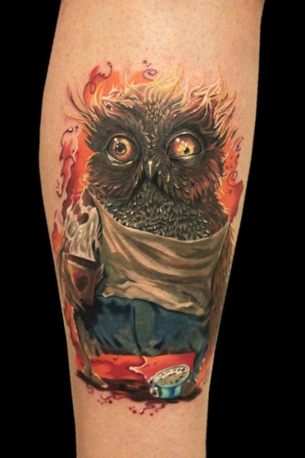 滑稽彩色卡通猫头鹰与时钟纹身图案