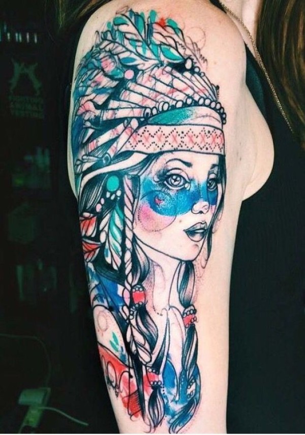大臂彩色卡通印度女生肖像与头盔纹身图案