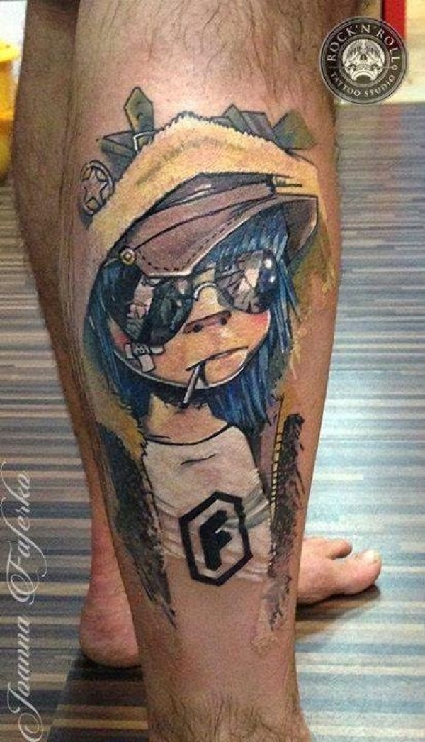 小腿彩色卡通男孩与香烟纹身图案
