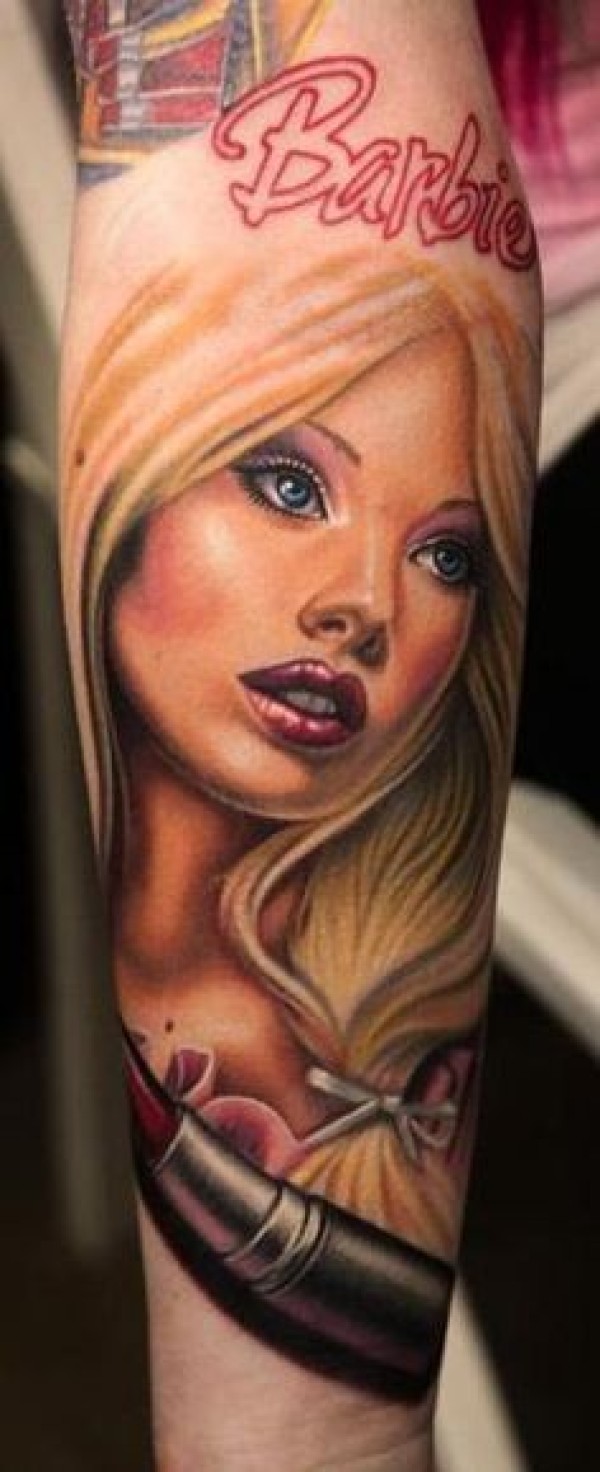 小臂卡通芭比娃娃和字母彩色纹身图案