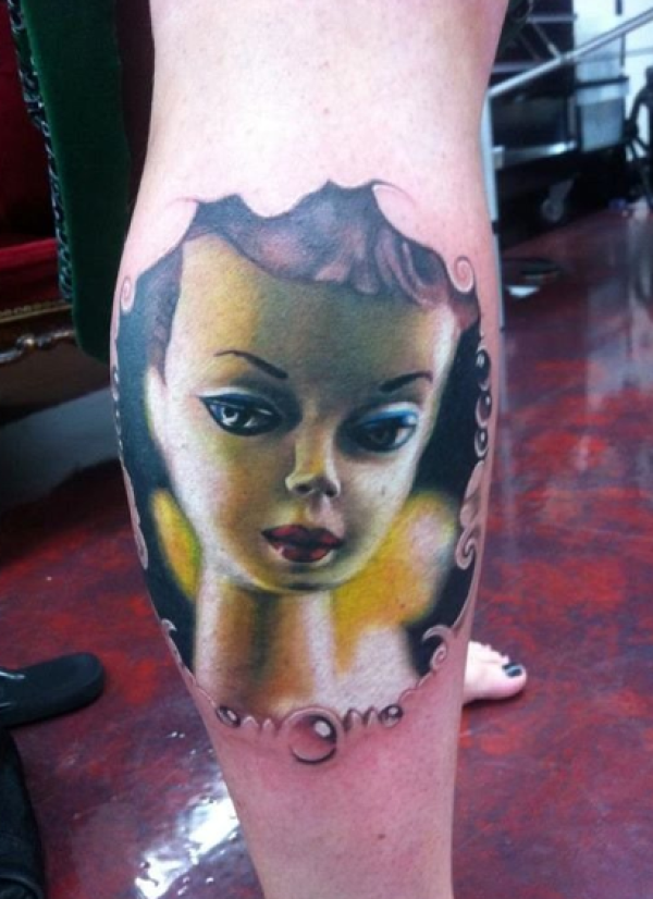 小腿彩色卡通娃娃脸纹身图案