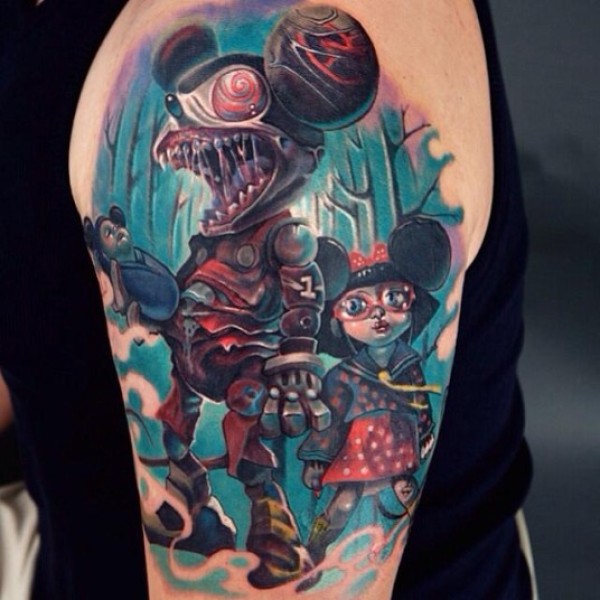 大臂彩色邪恶卡通米老鼠纹身图案