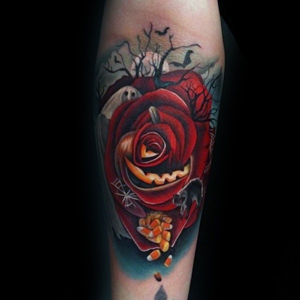 胸部彩色红玫瑰与药丸纹身图案
