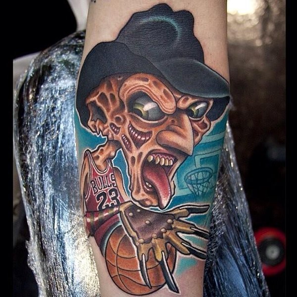 小臂彩色卡通怪物打篮球纹身图案