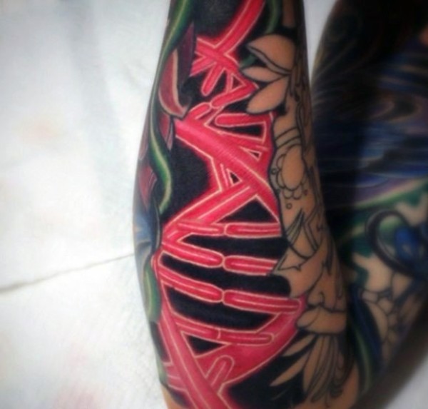 胸部红色发光的DNA符号纹身图案
